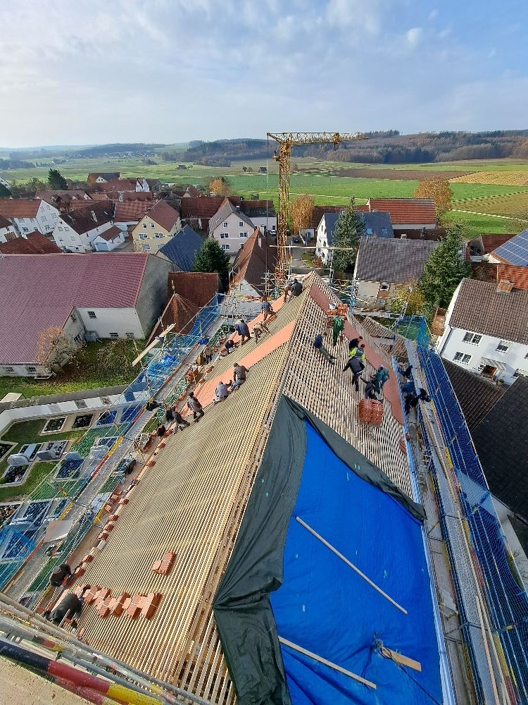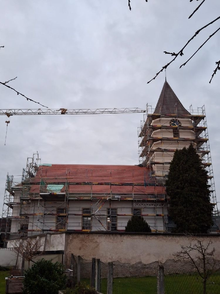 Am Dachstuhl mussten an einigen Stellen Balken erneuert werden. Das Gesims wurde neu betoniert, diesmal so, dass das Holz nicht mit der Feuchtigkeit des Betons in Berührung kommen kann. Risse in der Wand werden geschlossen, das Dach neu gedeckt, viele Detailarbeiten sind nötig. Viele, viele fleißige Menschen helfen jeden Tag auf der Baustelle mit. Die Handwerker leisten ausgezeichnete Arbeit und leiten die Helfer gekonnt an. Unser Architekt Hubert Koukol betreut die Baustelle intensiv, koordiniert die Handwerker und ist bei entstehenden Fragen stets zur Stelle. Er ist beeindruckt von der großen Unterstützung durch unsere Gemeindemitglieder.